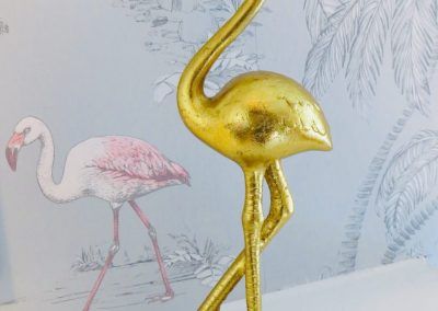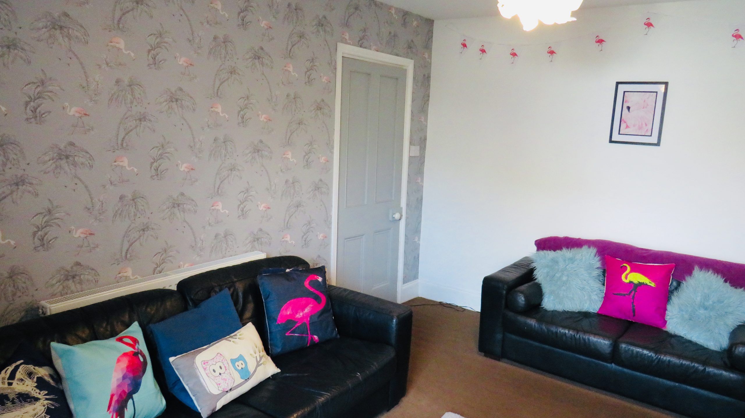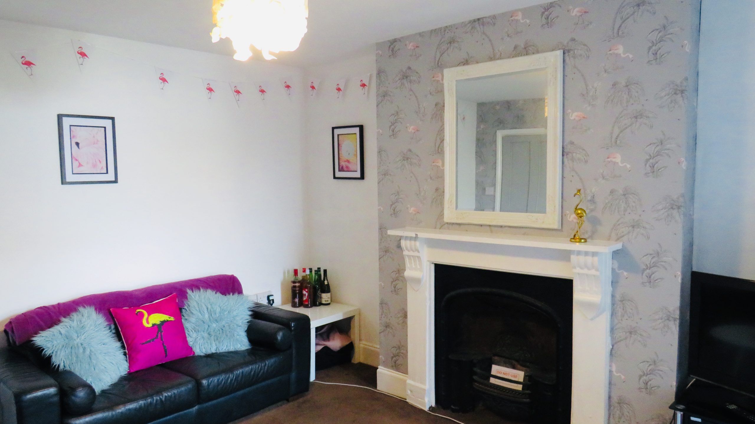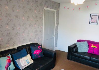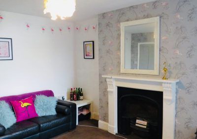 Freshly redecorated modern lounge with quirky interior and flat screen TV.